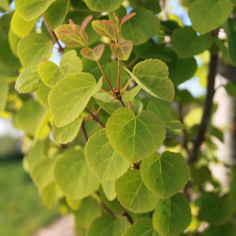 Le feuillage constitue l’attrait principal de l’espèce. Les feuilles, arrondies et cordiformes, mesurent de 4 à 8 cm de diamètre. Elles sont vert bleuté au printemps et en été, puis prennent à l’automne des teintes jaune doré, orangé et rouge écarlate.