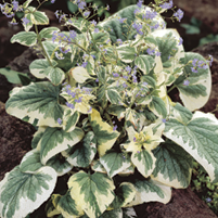 Floraison: Mai-juin, bleu, feuillage panaché vert et blanc
