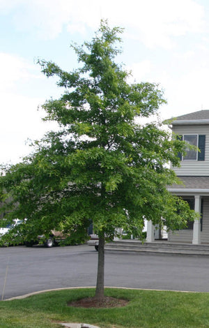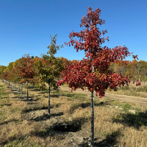 Le chêne des marais (Quercus palustris, Pin Oak) est un grand chêne indigène d’Amérique du Nord, naturellement présent dans les plaines inondables et les sols humides de l’est du continent. Il est reconnu pour sa croissance relativement rapide, son port pyramidal régulier en jeunesse et surtout sa coloration automnale rouge vif, parmi les plus intenses chez les chênes.