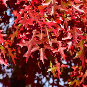 Le feuillage est composé de feuilles profondément lobées aux lobes pointus, vert foncé lustré durant l’été. À l’automne, l’arbre offre une coloration rouge écarlate à rouge pourpre, souvent spectaculaire et relativement constante d’une année à l’autre.