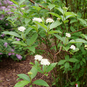 Le feuillage est composé de feuilles vert moyen ovales, prenant souvent des teintes rouge pourpré à l’automne. Au printemps apparaissent de petites fleurs blanches regroupées en corymbes, suivies en été de petites baies blanc bleuté appréciées par plusieurs oiseaux. Après la chute des feuilles, les rameaux rouge vif deviennent particulièrement décoratifs durant l’hiver.