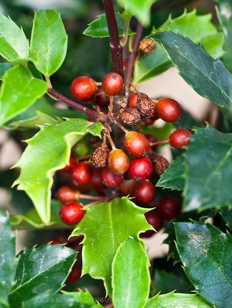Feuillage: Vert foncé luisante, piquante, bronze à l’automne