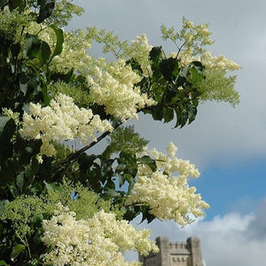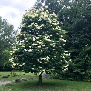 Le Syringa reticulata ‘Ivory Silk’ est une variété améliorée du lilas du Japon, développée au Canada dans les années 1970 par le célèbre sélectionneur Donald Wyman de l’Université Harvard pour sa floraison abondante, sa forme compacte et sa grande résistance aux conditions urbaines et au froid. Apprécié pour ses grandes panicules de fleurs blanc crème parfumées, on aime aussi son port élégant et son écorce décorative. Contrairement aux lilas communs qui fleurissent au printemps, ‘Ivory Silk’ offre une explosion florale en début d’été et s’intègre parfaitement dans les aménagements urbains et résidentiels du Québec. Actuellement, c'est un des petits arbres de ville les plus populaires!