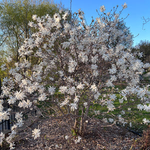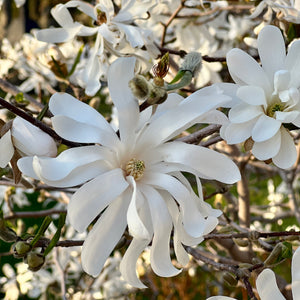 Grandes fleurs en forme d’étoiles, oeil jaune, avant les feuilles, plus tardives que les autres magnolias. Bonne terre de jardin, acide, fraîche.