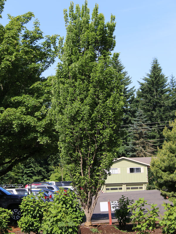 La floraison et la coloration automnale demeurent discrètes, ce qui en fait un arbre davantage apprécié pour sa fonction et sa résilience que pour son effet ornemental saisonnier. Bien que plus étroit que l’espèce type, il nécessite tout de même une hauteur dégagée pour exprimer pleinement son port colonnaire.
