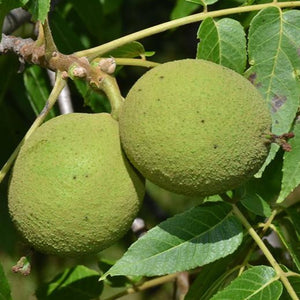 🔹 Noix globuleuses, vertes, de 4 à 6 cm de diamètre, devenant brun foncé à maturité (septembre-octobre).
