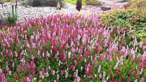 Couvre-sol très efficace formant des épis de fleurs roses. Feuillage bronze à l’automne.